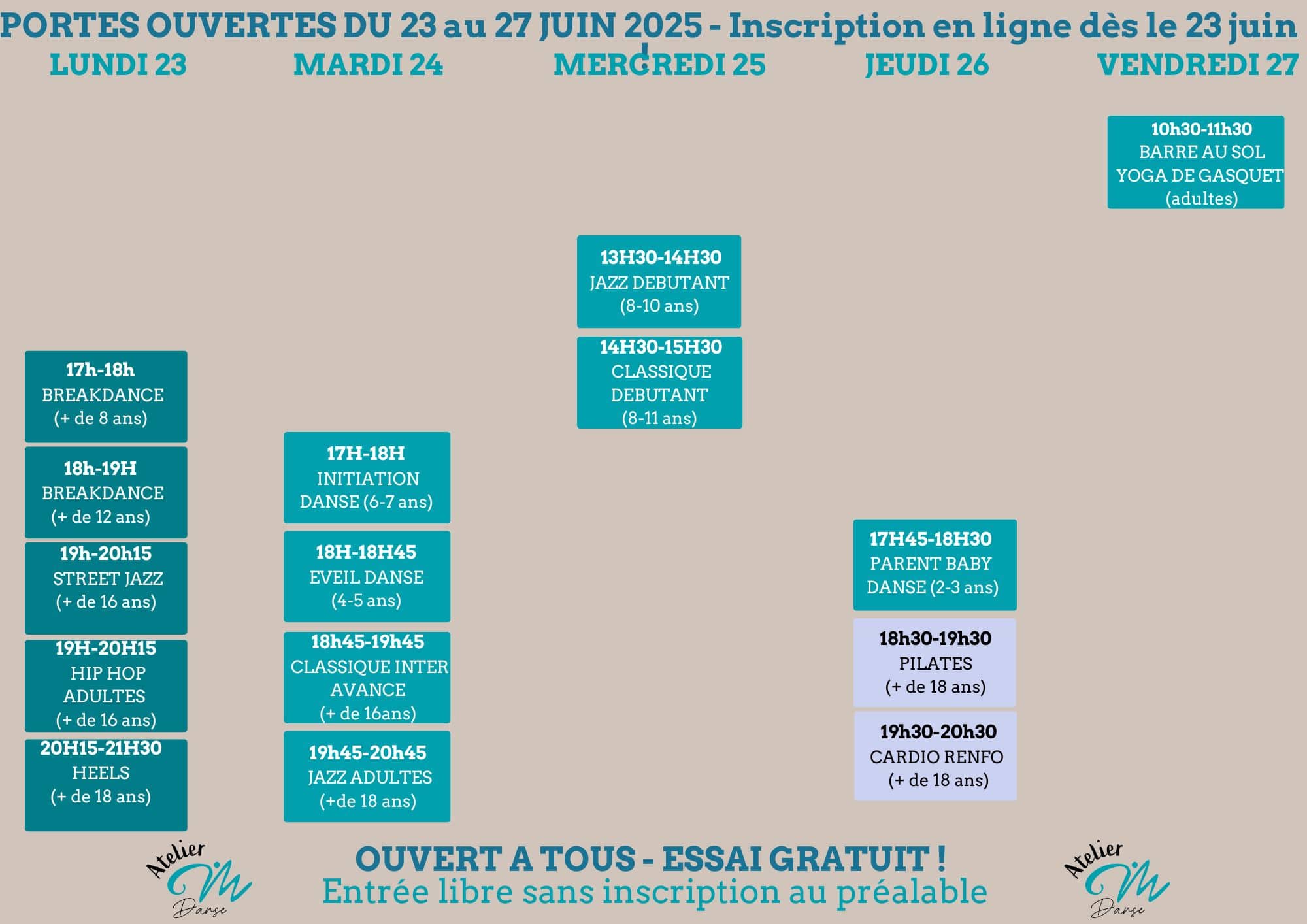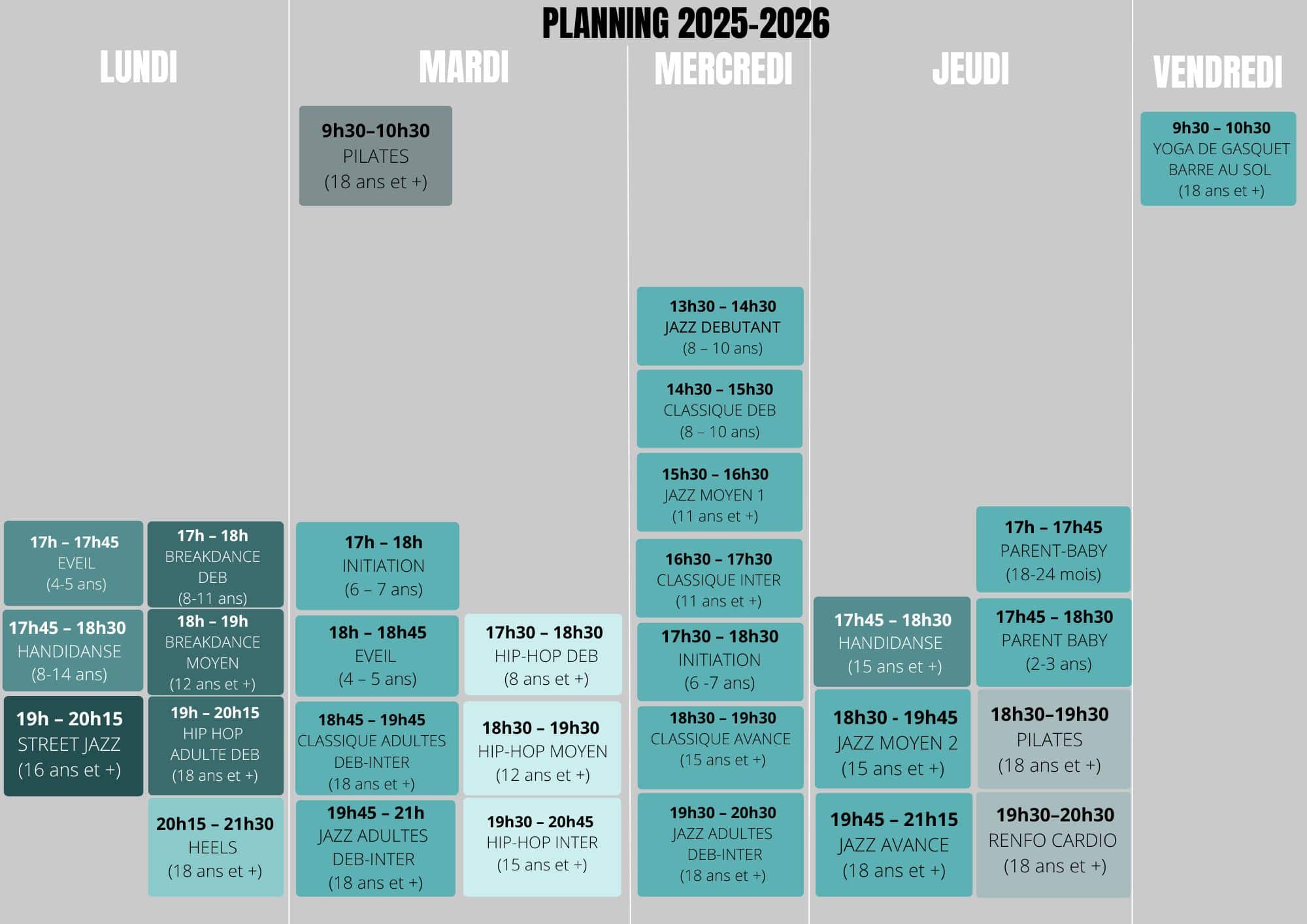 A l’Atelier, vous trouverez des cours de danse Jazz, Contemporain, Hip-Hop, Street jazz, Classique, Heels, Eveil, Initiation, Yoga de gasquet, Barre au sol, Pilates, Fitness, Danse adaptée, Parent-enfant, Parent-baby…