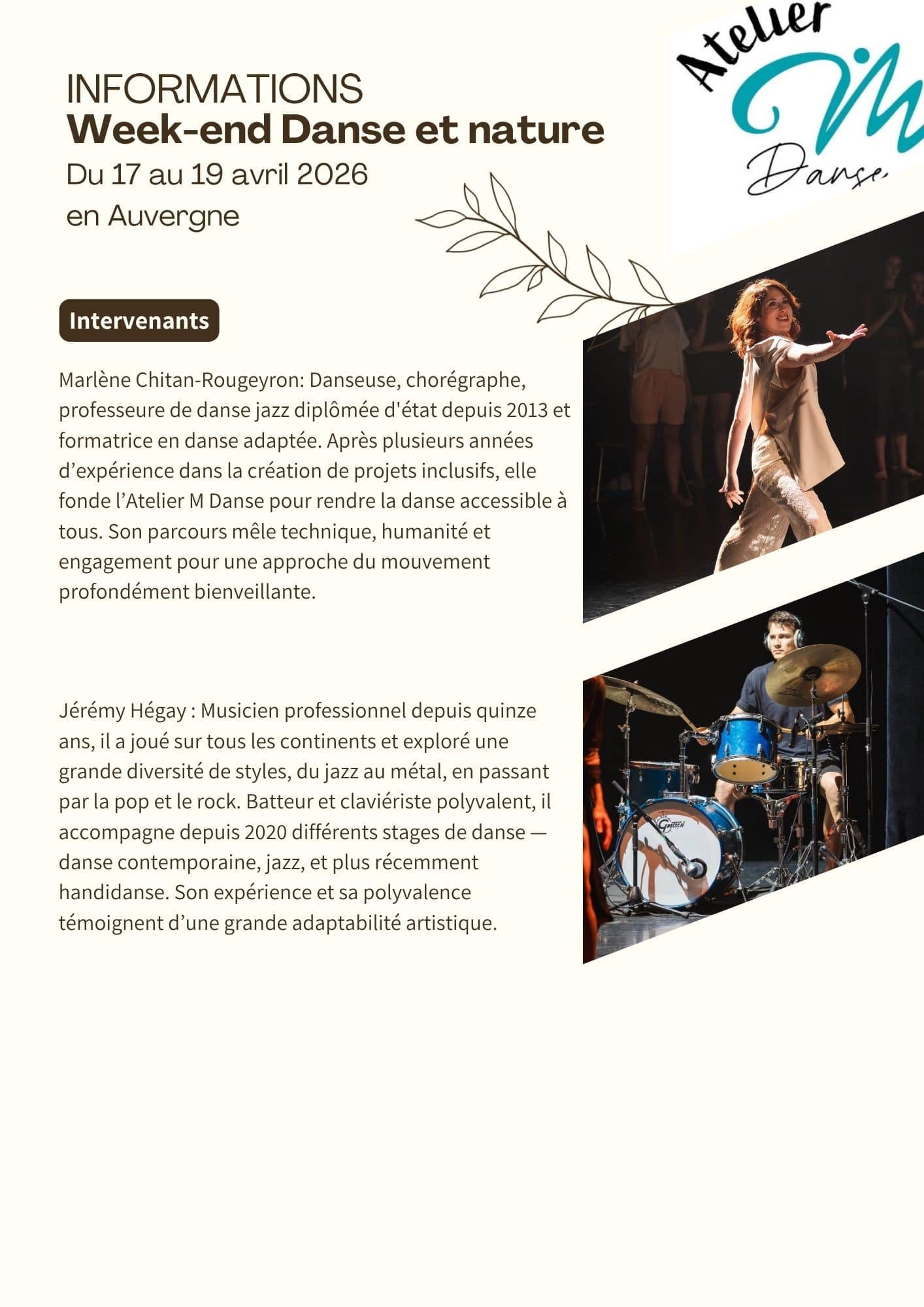 Rejoignez nous pour un week-end 100% danse en pleine nature ! Au programme : Stage de danse animé par Marlène Chitan et accompagné par un musicien professionnel, dans une salle de 150m2 / Yoga / barre au sol / Danse libre / Modern’ Jazz / Contemporain / Balades en nature / Moments de partage dans un cadre exceptionnel et une ambiance bienveillante.
